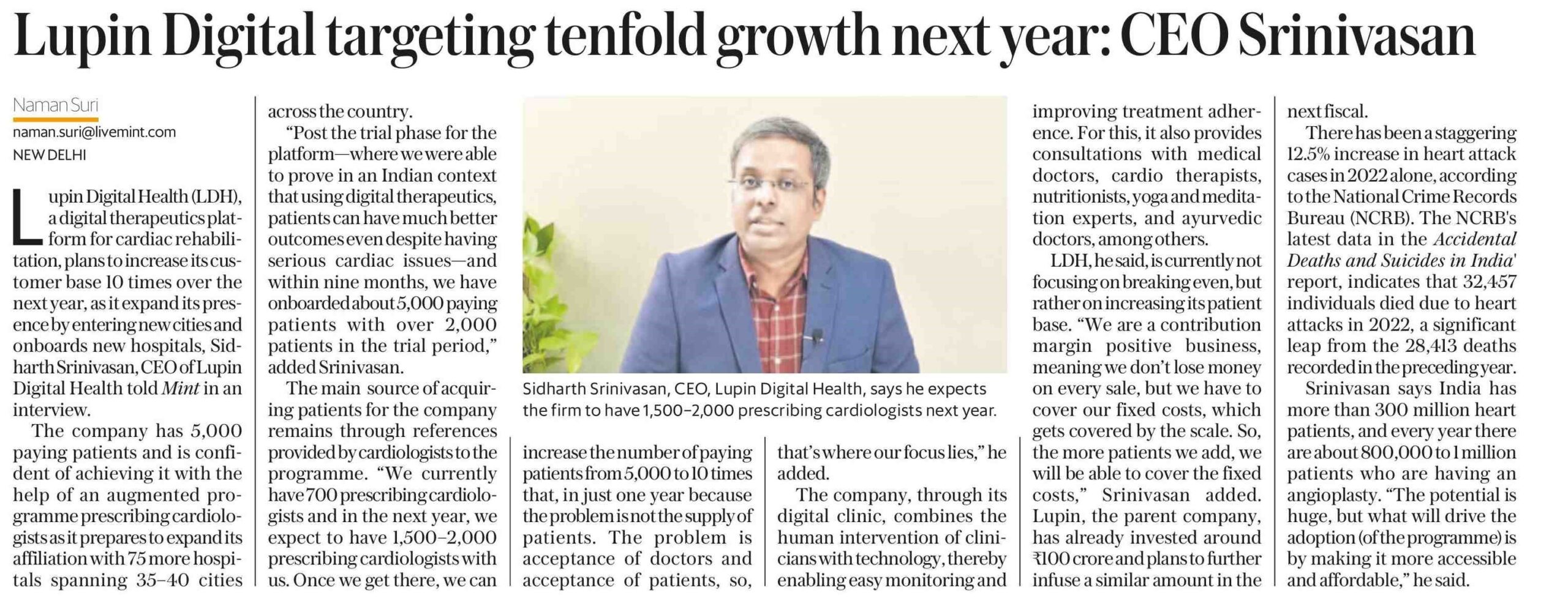 Sidharth Srinivasan, CEO, Lupin Digital Health in an interview with Mint on ‘Lupin Digital targeting tenfold growth next year’