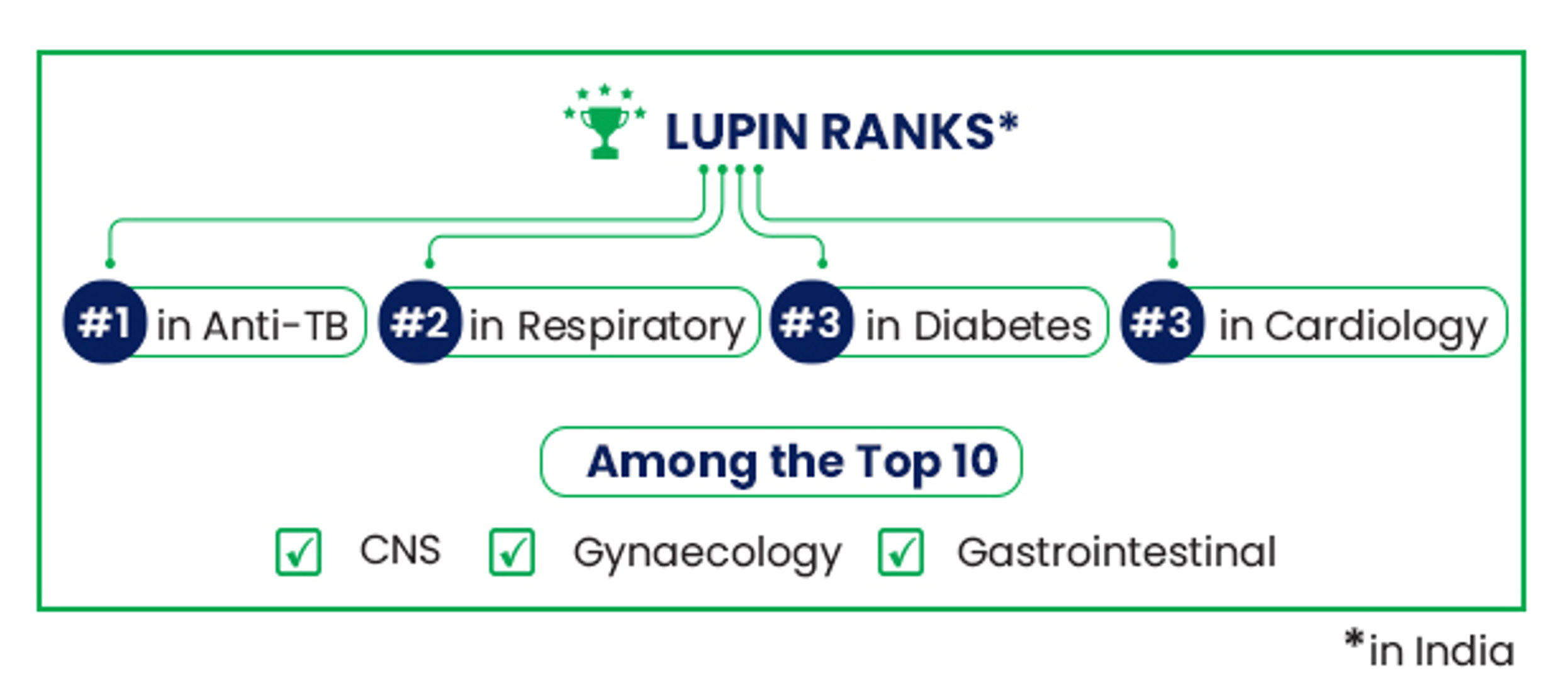 Lupin’s branded generic business is ranked #6 in the Indian Pharmaceutical Market (IPM). Our top five therapies are cardiovascular, diabetes, respiratory, anti-infective and gastrointestinal. We also have a significant presence in CNS, gynaecology, pain management and vitamin-mineral supplements, among others. In the past, we have also forayed into urology, dermatology and paediatric respiratory therapy in India.