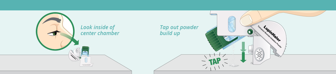 Look in the center chamber for tiotropium capsule pieces or powder buildup. If seen, tap out